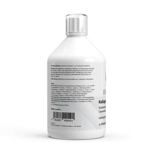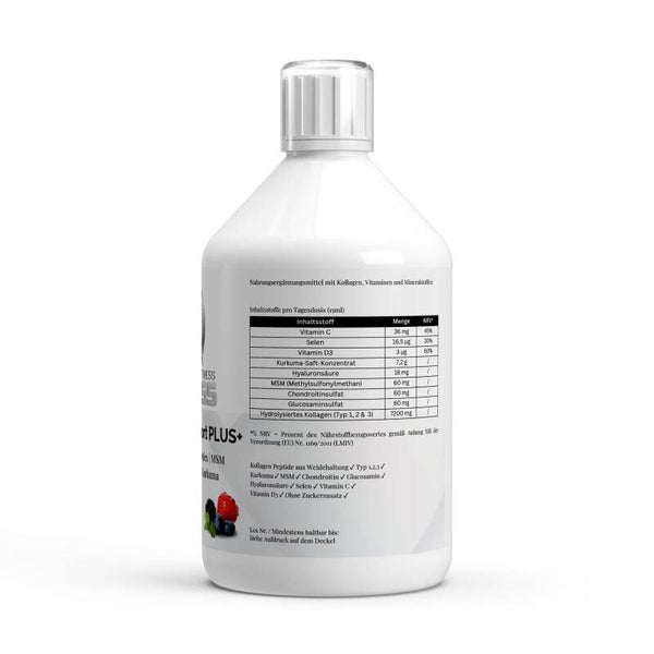 Kurkumasaft aus Konzentrat, hydrolysiertes Kollagen Typ 1, 2 & 3 (enthält die Aminosäuren: L-Glycin, L-Prolin, L-Alanin, L-Hydroxyprolin, L-Glutaminsäure, L-Arginin, L-Asparaginsäure, L-Serin, L-Lysin, L-Leucin, L-Valin, L-Threonin, L-Phenylalanin, L-Isoleucin, L-Hydroxylysin, L-Methionin, L-Histidin, L-Tyrosin, L-Cystein), Säureregulator (Citronensäure), Vitamin C, MSM (Methylsulfonylmethan), Glucosaminsulfat, Chondroitinsulfat, Hyaluronsäure, Aroma (natürliches Aroma), Konservierungsstoffe (Kaliumsorbat, Natriumbenzoat), Farbstoff (Süßkartoffelpulver), Süßungsmittel (Sucralose, Acesulfam-K), Selen, Vitamin D.